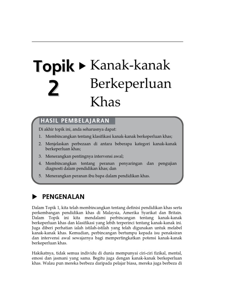 Lesen Sie 30 Tage kostenlos. Kanak-kanak berkeperluan khas dianggap kanak-kanak yang dianggap berhadapan dengan batasan keupayaan dengan sendirinya bagi memperoleh keperluan biasa dan untuk hidup bermasyarakat kerana had fizikal dan mentalnya Mahmood Nazar 2000. Menurut Wright 1998 Kanak-kanak khas didefinisikan sebagai kanak-kanak yang berbeza daripada kanak-kanak biasa dalam aspek ciri-ciri mental keupayaan sensori keupayaan komunikasi tingkah laku sosial ataupun ciri-ciri fizikal.