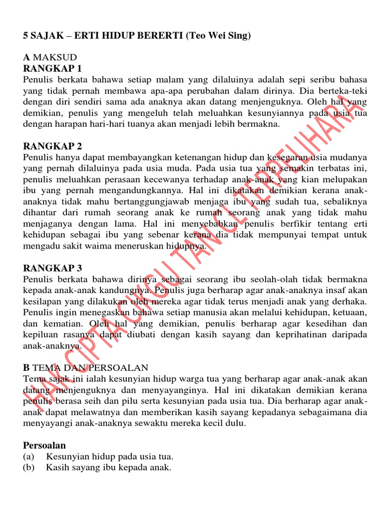 Sajak ERTI HIDUP BERERTI karya Teo Wei Sing- Antologi Sejadah Rindu - YouTube. Koleksi Nota Ringkas dan Padat Soalan Latihan KBAT Peperiksaan Ujian Tingkatan 1 2 3 4 5 dan Tahun 1 2 3 4 5 6. Tema dan Persoalan Komsas Tingkatan 5 TEMA kesunyian hidup yang dilalui oleh golongan warga tua yang sentiasa mendambakan kasih sayang daripada anak-anaknya serta berharap agar anak-anaknya datang menjenguknya.