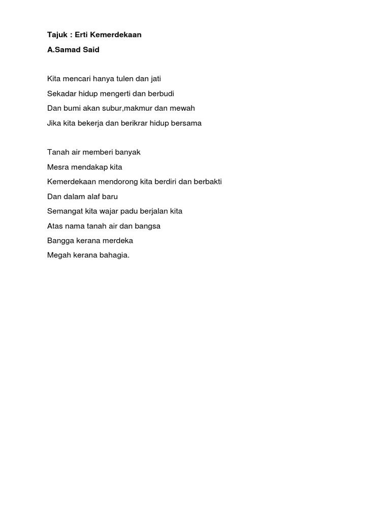 A Samad Said ERTI KEMERDEKAAN Kita mencari hanya yang tulen dan jati sekadar hidup mengerti dan berbudi dan bumi akan subur makmur dan mewah jika kita bekerja dan berikrar hidup bersama tanah air memberi banyak mesra mendakap kita kemerdekaan mendorong kita berdiri dan berbakti dan dalam alaf baru semangat kita wajar padu berjalan kita. Di pentas dikir barat. Newer Post Older Post Home.